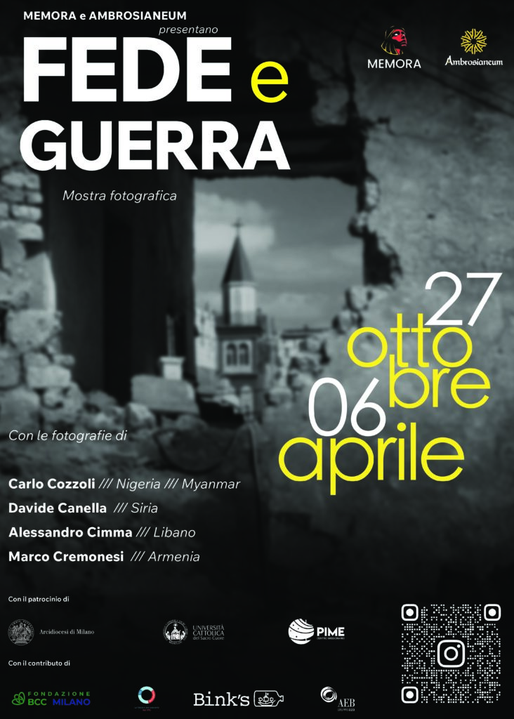 Ambrosianeum e Memora presentano la mostra fotografica FEDE e GUERRA dal 27 ottobre 2025 al 6 aprile 2026 presso gli spazi di Ambrosianeum. Attraverso gli sguardi dei fotografi Carlo Cozzoli, Davide Canella, Alessandro Cimma e Marco Cremonesi, si raccontano diversi conflitti attuali del mondo in cui viviamo: Armenia, Siria, Libano, Myanmar e Nigeria sono i luoghi dove sono state scattate le fotografie che compongono la mostra.