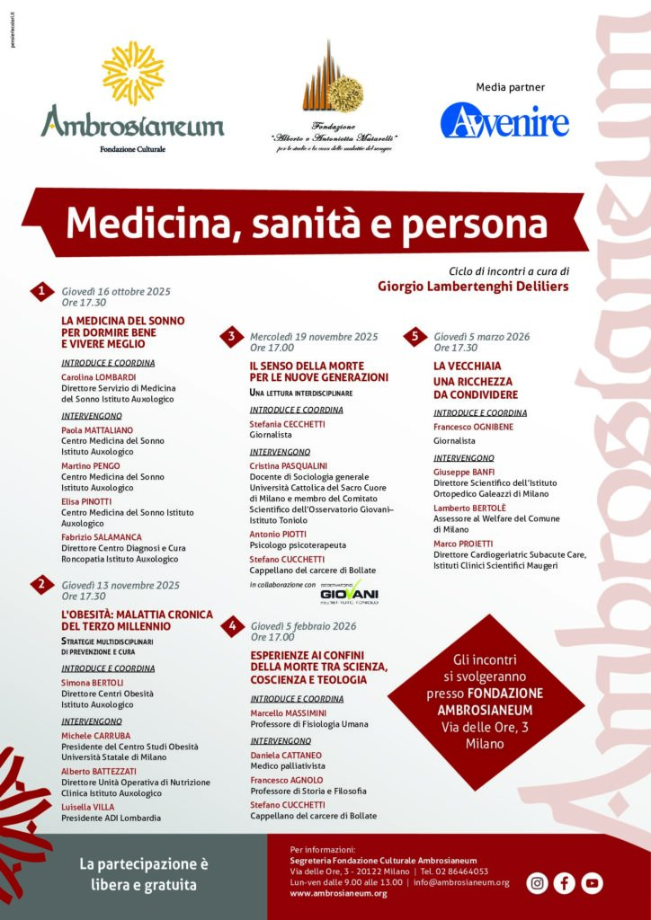 Anche quest'anno Ambrosianeum, in collaborazione con la Fondazione Matarelli e la media partnership di Avvenire, presenta la rassegna "Medicina, sanità e persona" a cura del professore Giorgio Lambertenghi Deliliers.