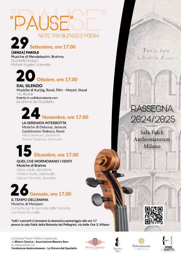 Domenica 29 Settembre alle ore 17.00:(Senza) Parole”, primo appuntamento di “Pause”, la nuova rassegna di musica da camera ideata da Milano Classica e Associazione Maestro Raro che avrà come sede la Fondazione Ambrosianeum.