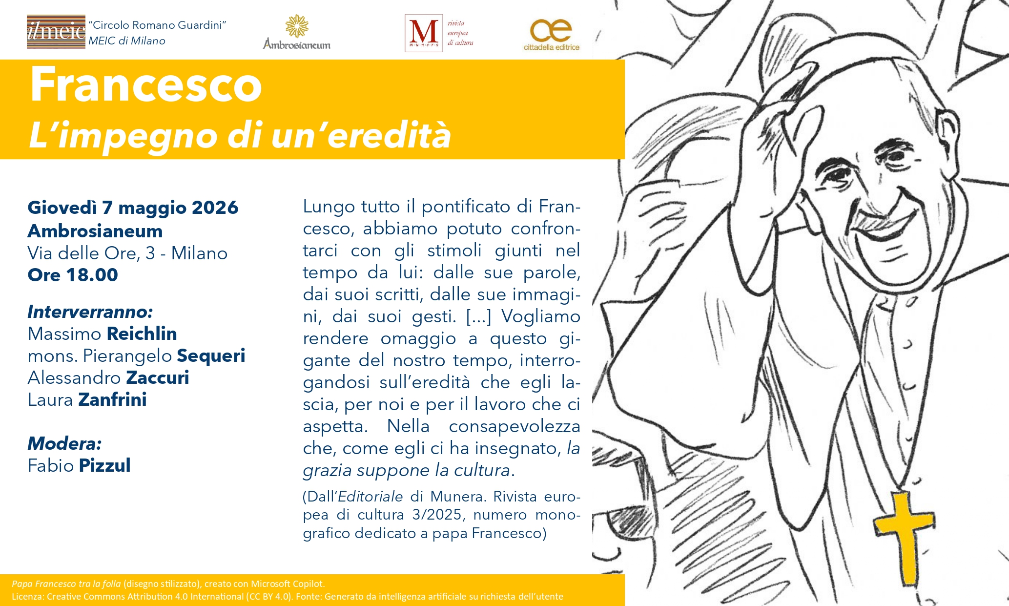 Nel primo anniversario della morte di papa Francesco, il MEIC di Milano, insieme a Fondazione Ambrosianeum, alla rivista Munera e a Cittadella Editrice, promuove un incontro di riflessione e approfondimento dedicato al lascito del Pontefice.